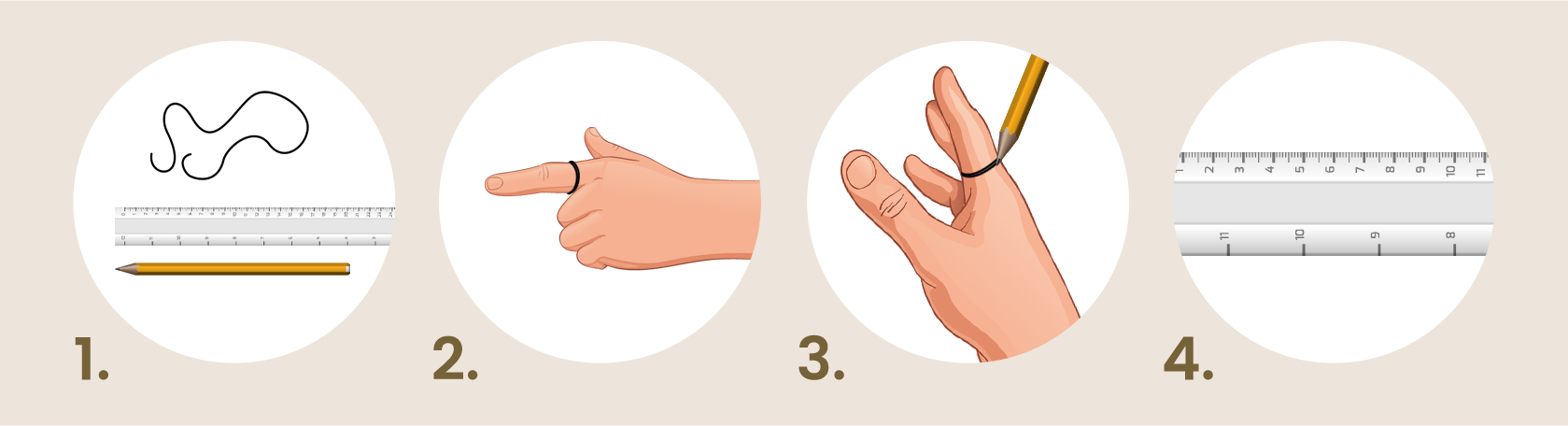 سایز انگشتر یا حلقه: برای تعیین سایز انگشتر یا حلقه طلا، به یک نخ و خط کش نیاز دارید. نخ را به دور انگشت خود بپیچید و زمانیکه دو انتهای نخ به هم رسید آن نقطه را علامت بزنید. سپس نخ را روی خط کش پهن کنید تا طول آن را به میلیمتر بدست آورید.